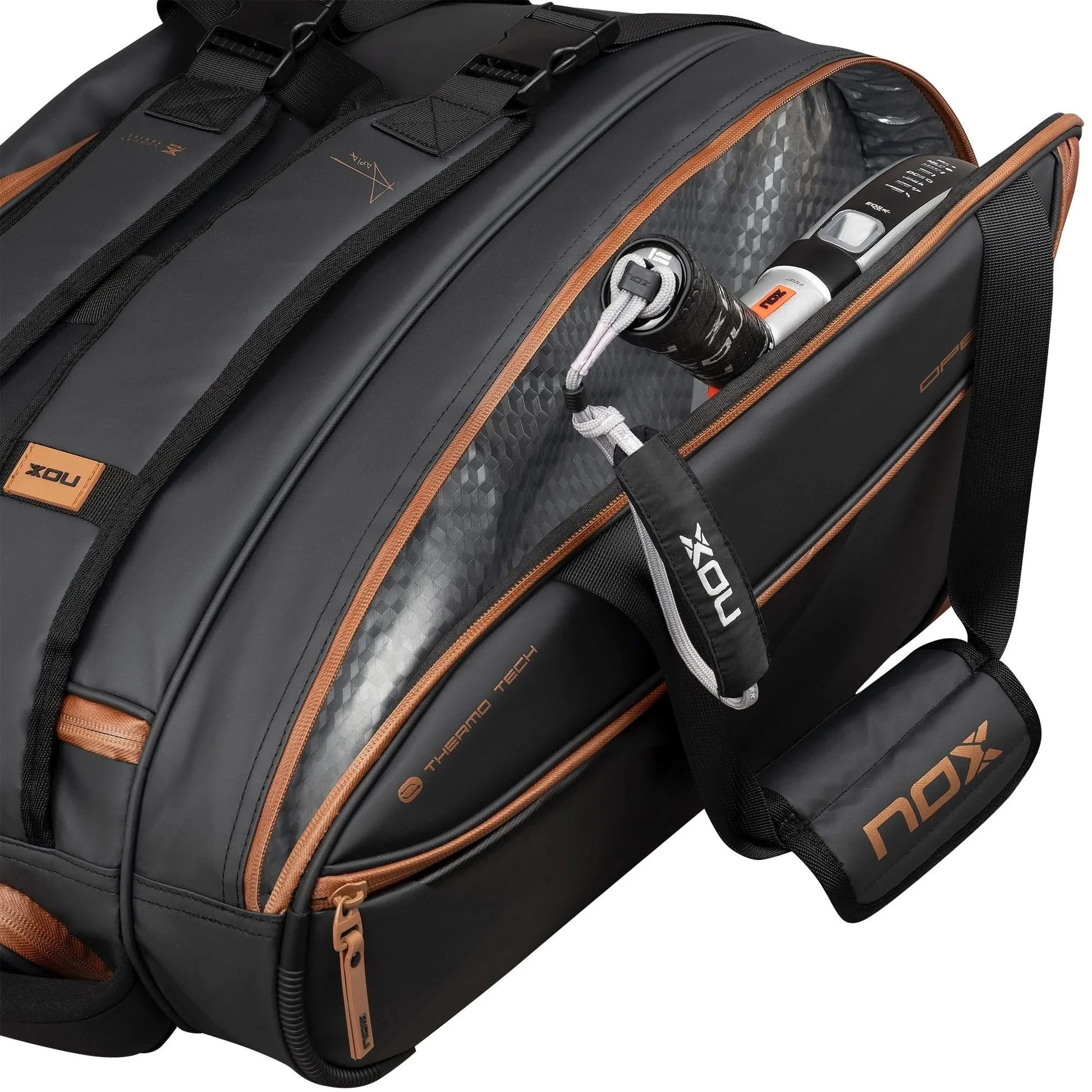 - Thermal compartment (NOX ThermoTech technology) with capacity for 2 padel racket, bottles and other temperature sensitive items, ensuring protection against heat.